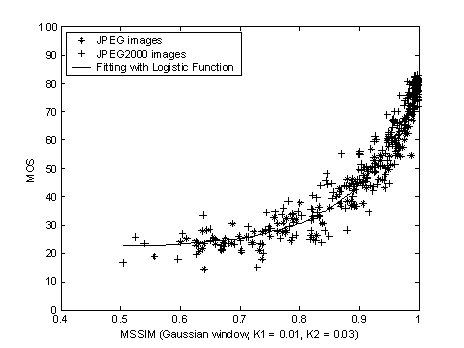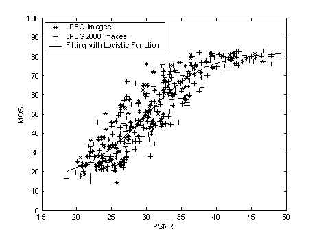 MOS) versus the objective predictions (PSNR and MSSIM) are shown below, where